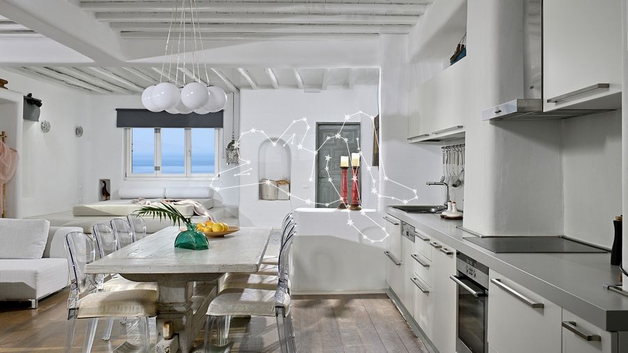 Το ακίνητο αποτελείται από τρεις εφαπτόμενες βίλες κυκλαδίτικης αρχιτεκτονικής, με λευκούς όγκους, φυσικά υλικά όπως πέτρα και ξύλο, και άμεση σύνδεση εσωτερικών και εξωτερικών χώρων. Οι εσωτερικοί χώροι, συνολικής επιφάνειας περίπου 600 τ.μ., αναπτύσσονται σε τέσσερα κλιμακωτά επίπεδα.