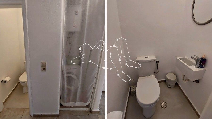 The interior features an open-plan studio layout designed for efficient use of space, with a decorative separator distinguishing the living area from the bedroom. A spacious bathroom, an additional WC, generous cabinetry, and a storage area ensure convenience and functionality for both short-term stays and long-term living.
