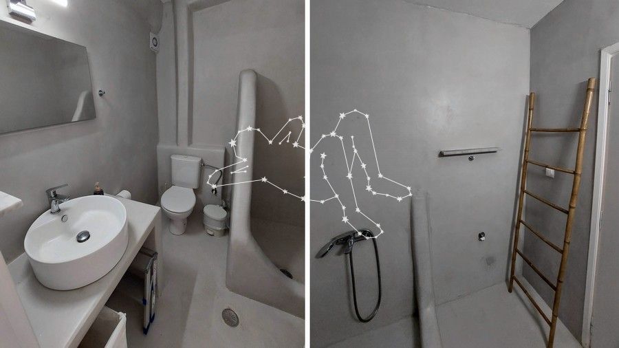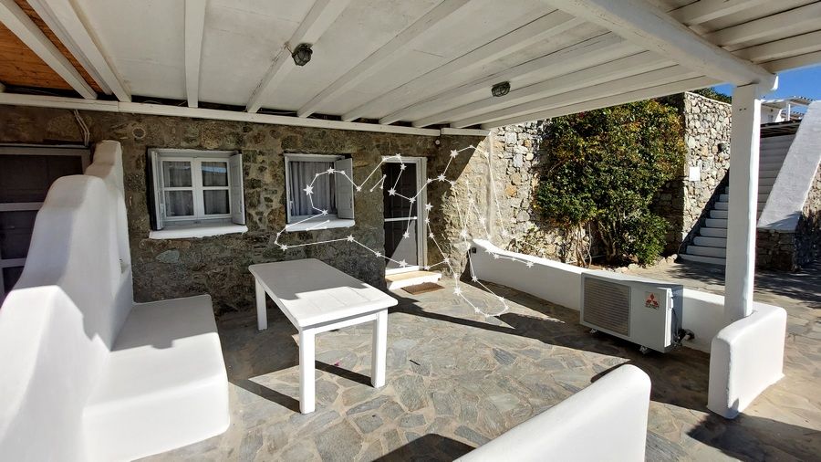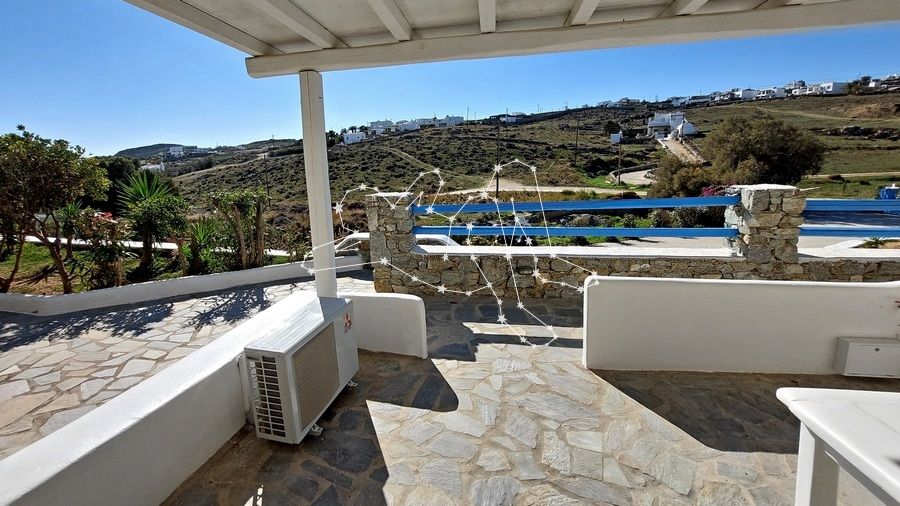 The large outdoor terrace, shaded by a traditional pergola, enjoys sweeping views of the surrounding Cycladic landscape. Though not sea-facing, the terrace offers a peaceful setting ideal for dining, lounging, and enjoying the natural beauty of Mykonos.