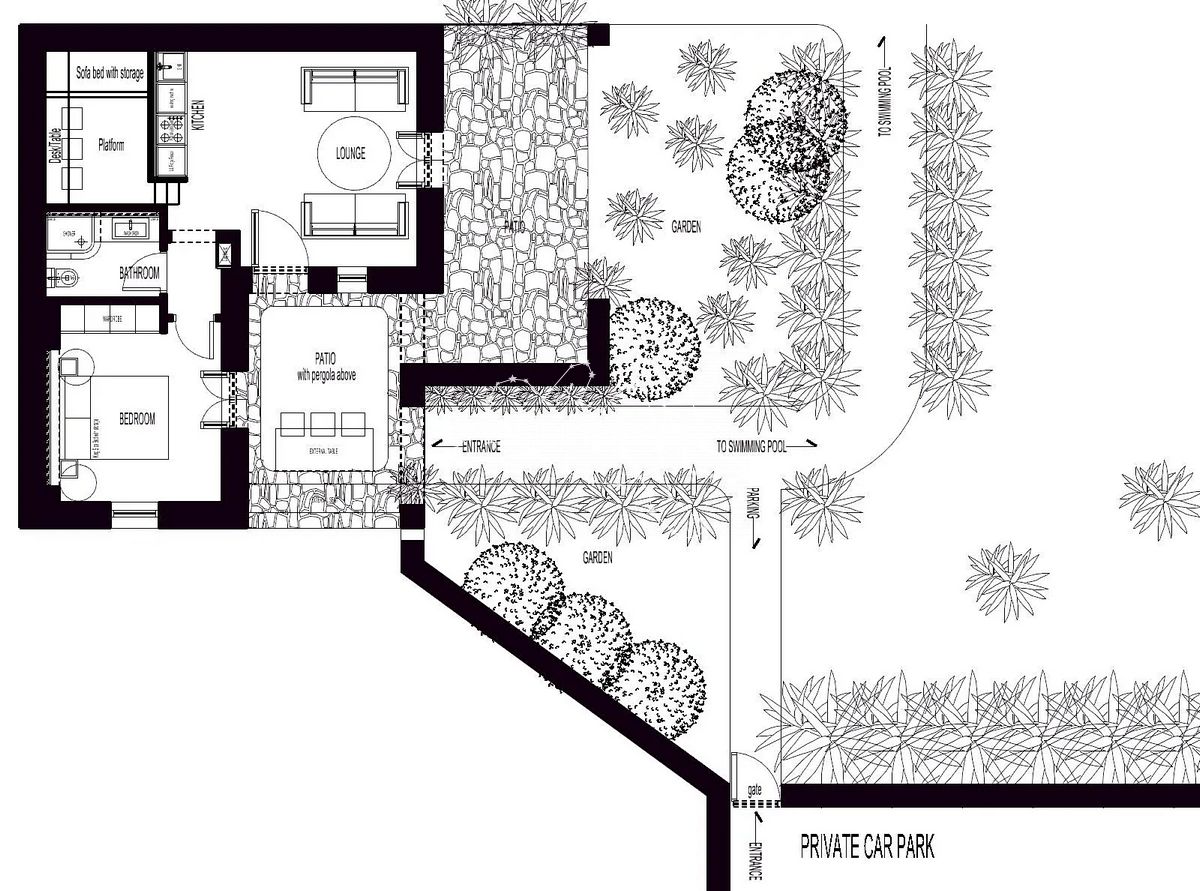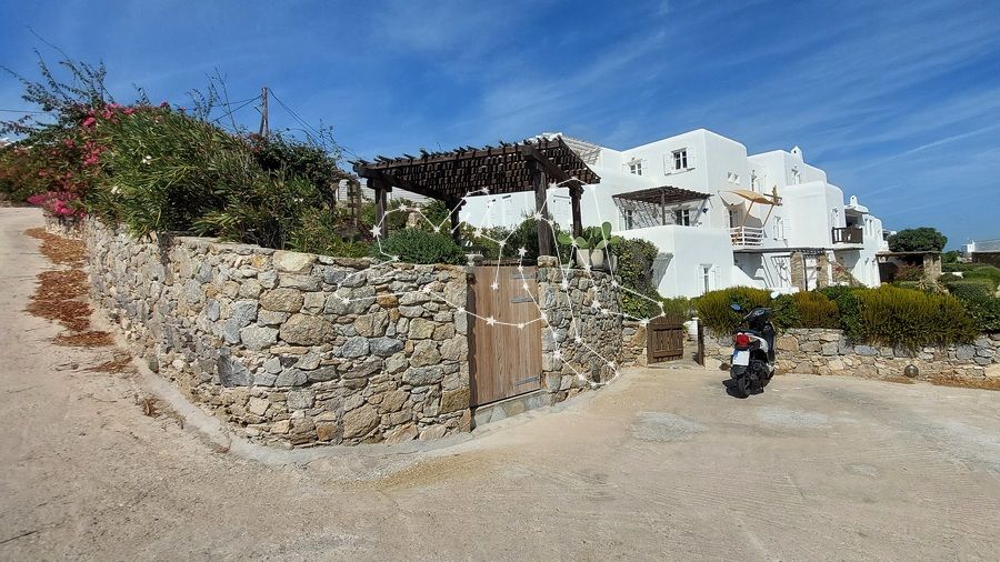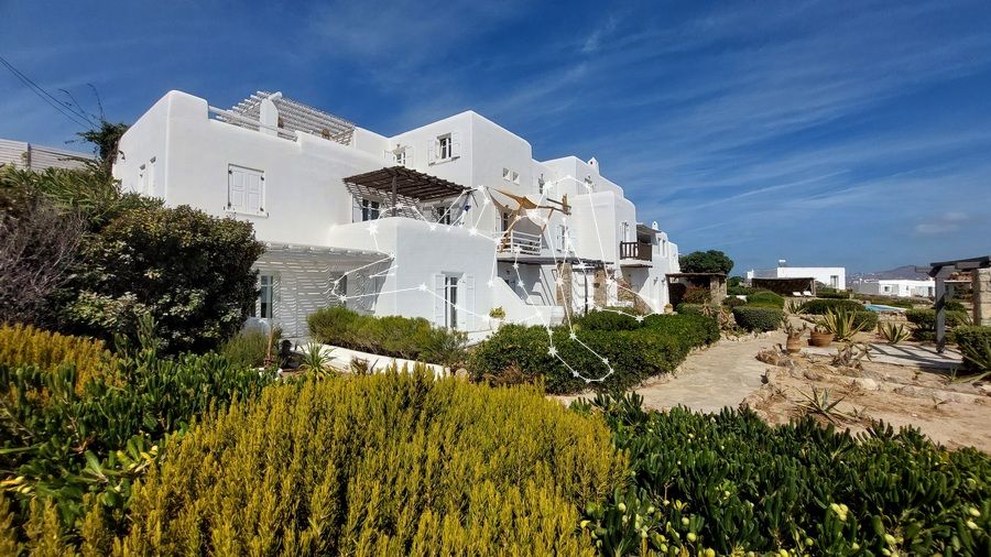 Οι εξωτερικοί χώροι περιλαμβάνουν την ιδιωτική ηλιόλουστη βεράντα, με την υπαίθρια τραπεζαρία που είναι καλυμμένη με πέργκολα. Τα κατάφυτα παρτέρια του κοινόχρηστου περιβάλλοντα χώρου ενισχύουν το αίσθημα της χαλάρωσης των ενοίκων. Η κοινόχρηστη πισίνα, που συντηρείται από τον Ιούνιο έως τον Οκτώβριο, αναδεικνύει τον νησιώτικο τρόπο ζωής, ενώ ο ιδιωτικός χώρος στάθμευσης, ελάχιστα πιο πέρα από το σπίτι, προσφέρει πρακτικότητα.